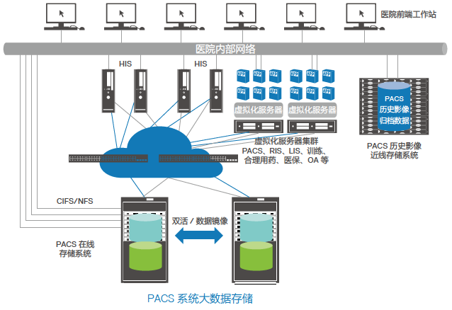 bifa必发官网针对医院 PACS 系统中海量医学影像数据管理、业务陆续在性要求高和性能要求一般等特点,对PACS系统的数据库存储,给予 SAN+NAS 统一存储解决方案;