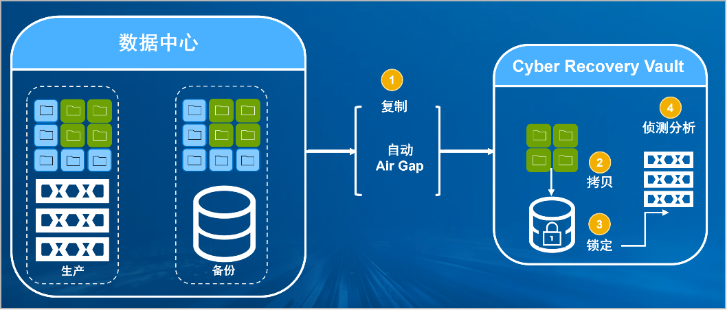 bifa必发官网防勒索病毒方案将生产中心备份数据复制到Vault区,复制后网络自动断开实现弹性隔离。Vault区的数据快速拷贝,并对拷贝版本加锁(在锁定期数据不允许删除和修改)。Vault沙箱内对拷贝版本进行扫描分析,验证数据是否完好。